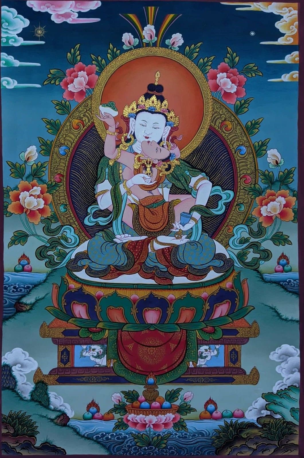 Vajrasattva is a bodhisattva in the Mahayana, Mantrayana/Vajrayana Buddhist traditions. In Tibetan Buddhism Vajrasatva is associated with the sambhogakāya and purification practice. The Vajrasattva mantra (The Hundred Syllable Mantra) is regarded as having the ability to purify karma, bring peace, and cause enlightened activity in general. In this thangka he appear with his consort.
